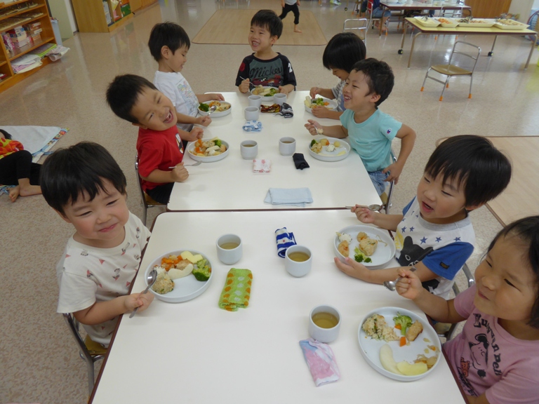 保育園の食事は0歳児~5歳児まで完全給食です。 給食・おやつは管理栄養士が園独自の献立を立てて、園内で調理しており、 離乳食は個々の進み具合によって月一単位で選んで頂けます。 また、個々に合わせて大盛りや特盛りへの変更も行っております。 アレルギーのあるお子様は、保護者と連携をとりながらアレルギー食(卵・乳の軽度のみ)の調理を行っております。