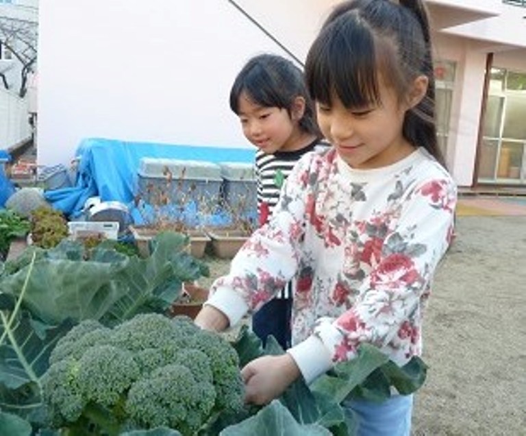 園庭を利用して様々な野菜や果物を育てています。 収穫した野菜は給食にも使われており、苦手な野菜も自ら収穫した物は食べれる園児もたくさんいます。